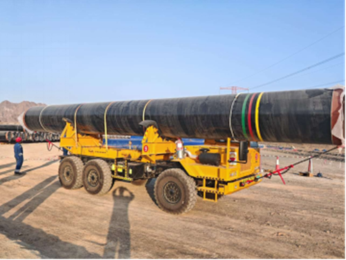 Deping technical team conducted a thorough study of the project, focusing on addressing key challenges and critical pain points in the construction process. To overcome the difficulty of transporting pipes in mountainous terrain using conventional trailers, the Deping team developed a dedicated pipe carrier based on a six-wheel-drive military chassis. This vehicle is capable of carrying steel pipes weighing approximately 10 tons, climbing up slopes exceeding 20°, and safely and efficiently transporting pipes from the laydown yard to the construction site.