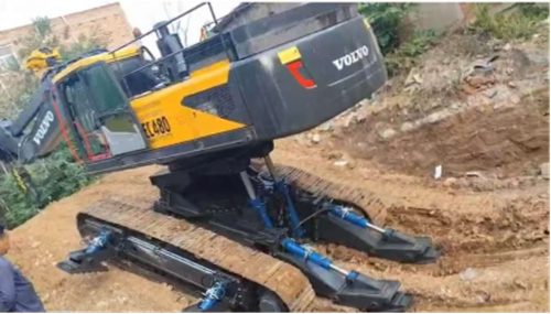 To resolve this challenge, Deping team conducted extensive upgrades to high-power excavators and developed a dedicated “pipe grab and fit-up platform”. By integrating a chassis pitch-levelling system, the platform maintains a safe center of gravity while climbing steep slopes with a clear visibility for the operator. A hydraulic stabilization system further enhances platform stability on slopes, enabling safe execution of subsequent pipe lifting and fit-up operations.